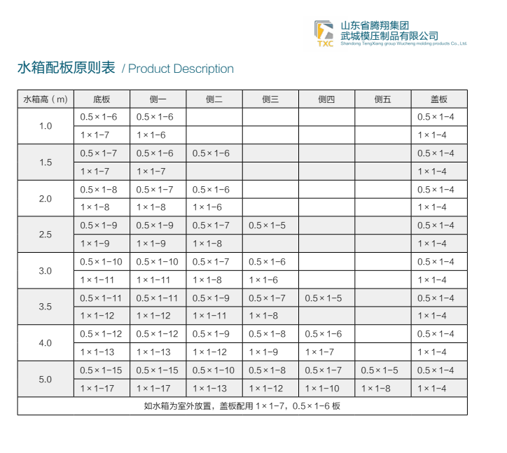 水箱配板原則表都有一個大概的行業(yè)標準,大部份的廠家會遵循這個標準來制作消防水箱,以下是山東騰翔集團的水箱配板原則表: