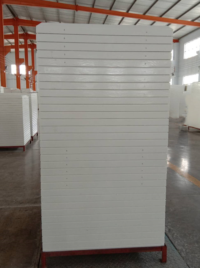 將備好的原材料根據規則的份額進行配料,然后拌和料漿成樹脂糊;將制成的樹脂糊與玻璃纖維紗通過SMC片材機組浸漬制成SMC片材;通過48h加溫固化后,查驗片材,依照所需標準進行裁剪、稱重、疊放、均勻鋪置于已經整理并升溫至120-140℃的模具中進行模壓并依照要求保壓后開模;脫模構成成型的SMC單板,對SMC單板的飛邊打磨修整后進行查驗;查驗合格的SMC單板按方位打好安裝孔,進行包裝、入庫;將SMC模壓單板、已按方位打好安裝孔的橡膠密封條、不銹鋼支架(拉筋)組合拼裝成SMC組合式水箱,查驗;查驗合格為制品。